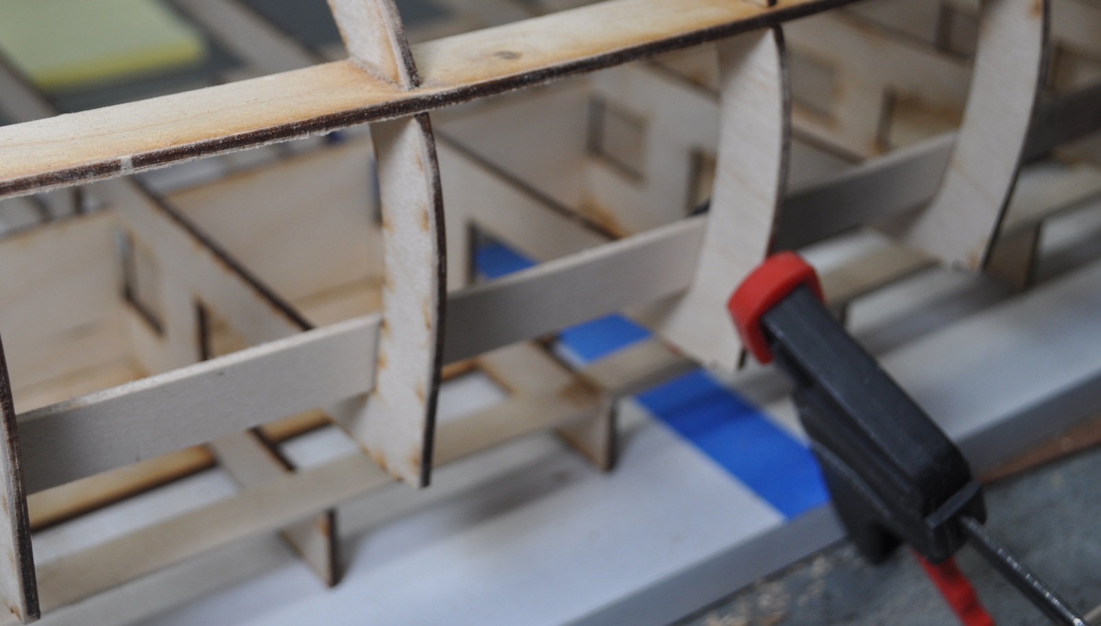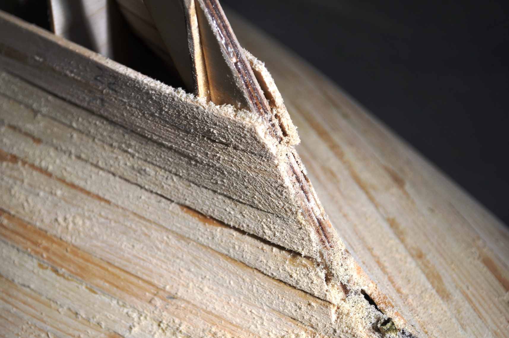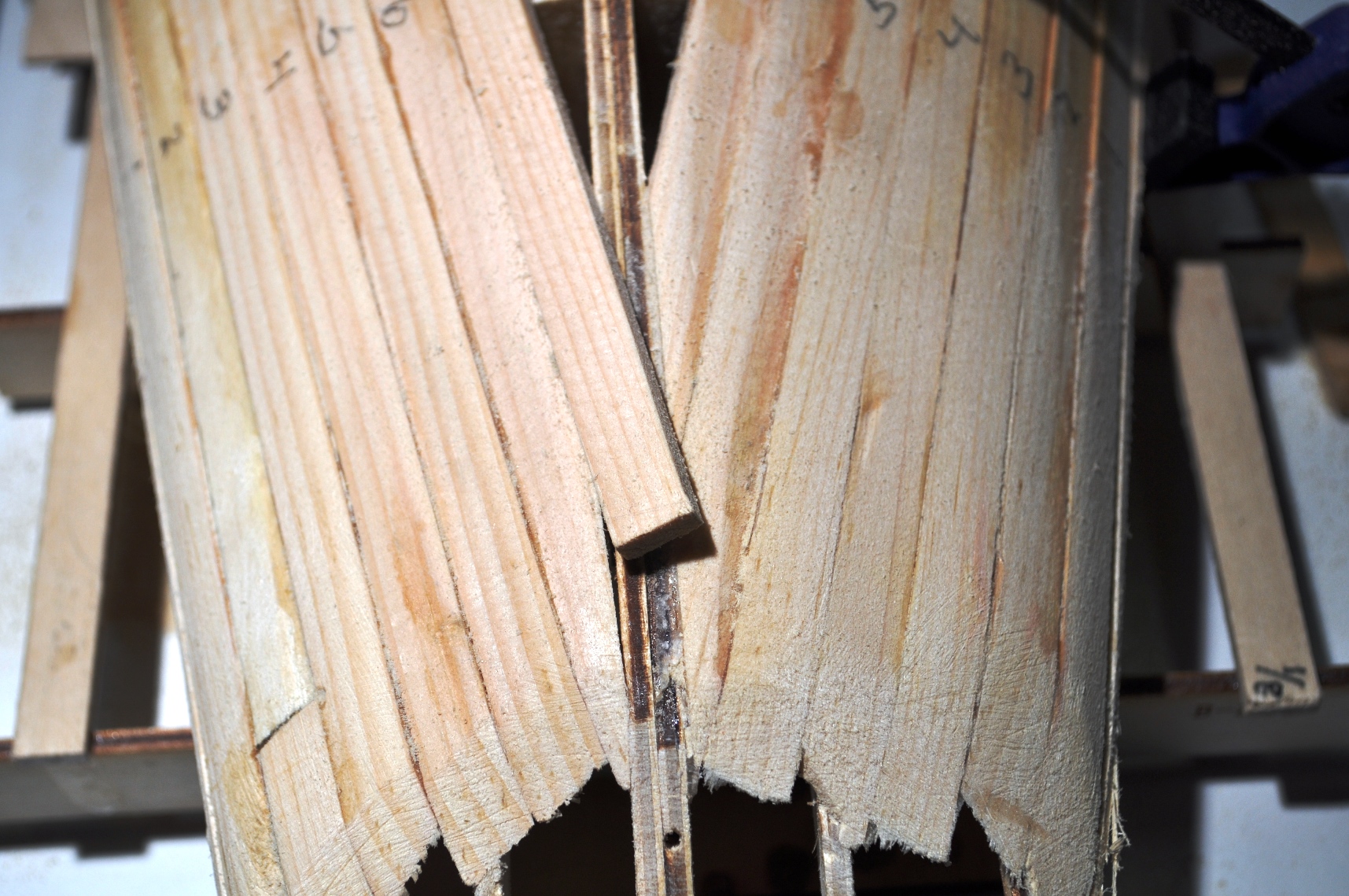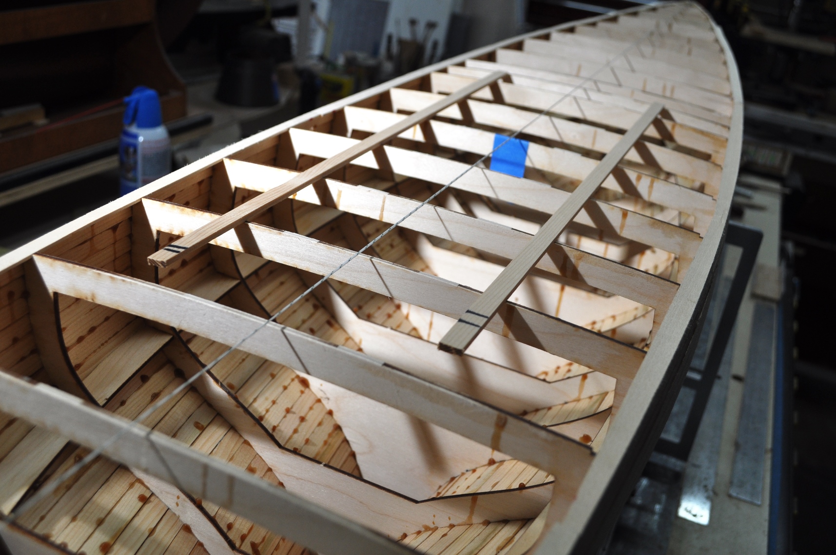 Note that, in this particular construction, planking starts at the sheer line, where the modeller has pinned a thin plank in the deck notch in order to establish the sheer. Note, also, that in this first construction, the builder has added some thin stock to the inside of the frames to add a little stiffness. After seeing this, we have added a horizontal stiffener to the frame set itself.