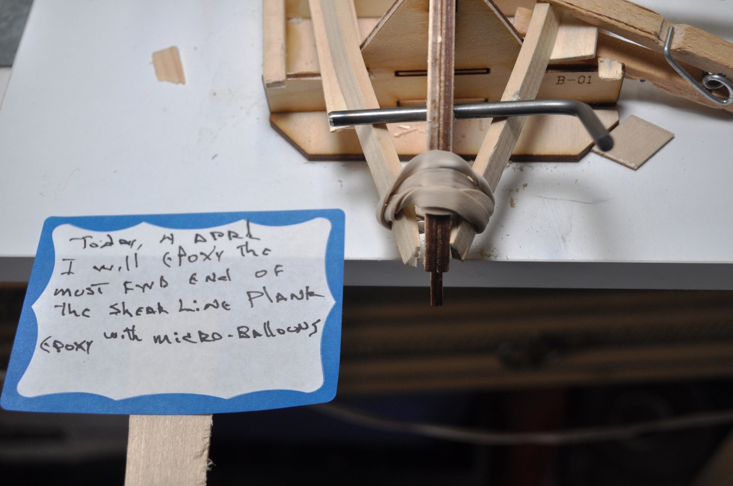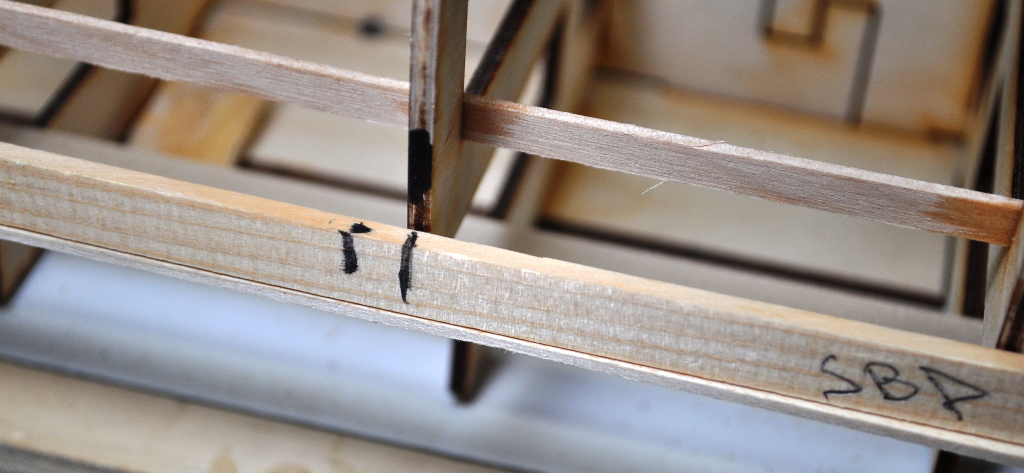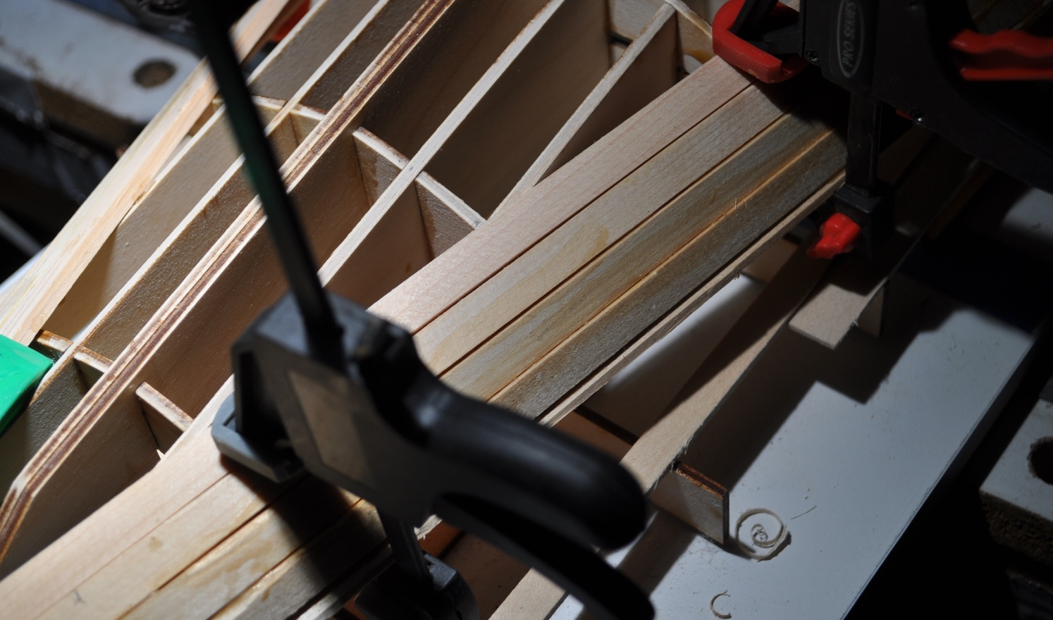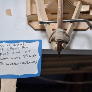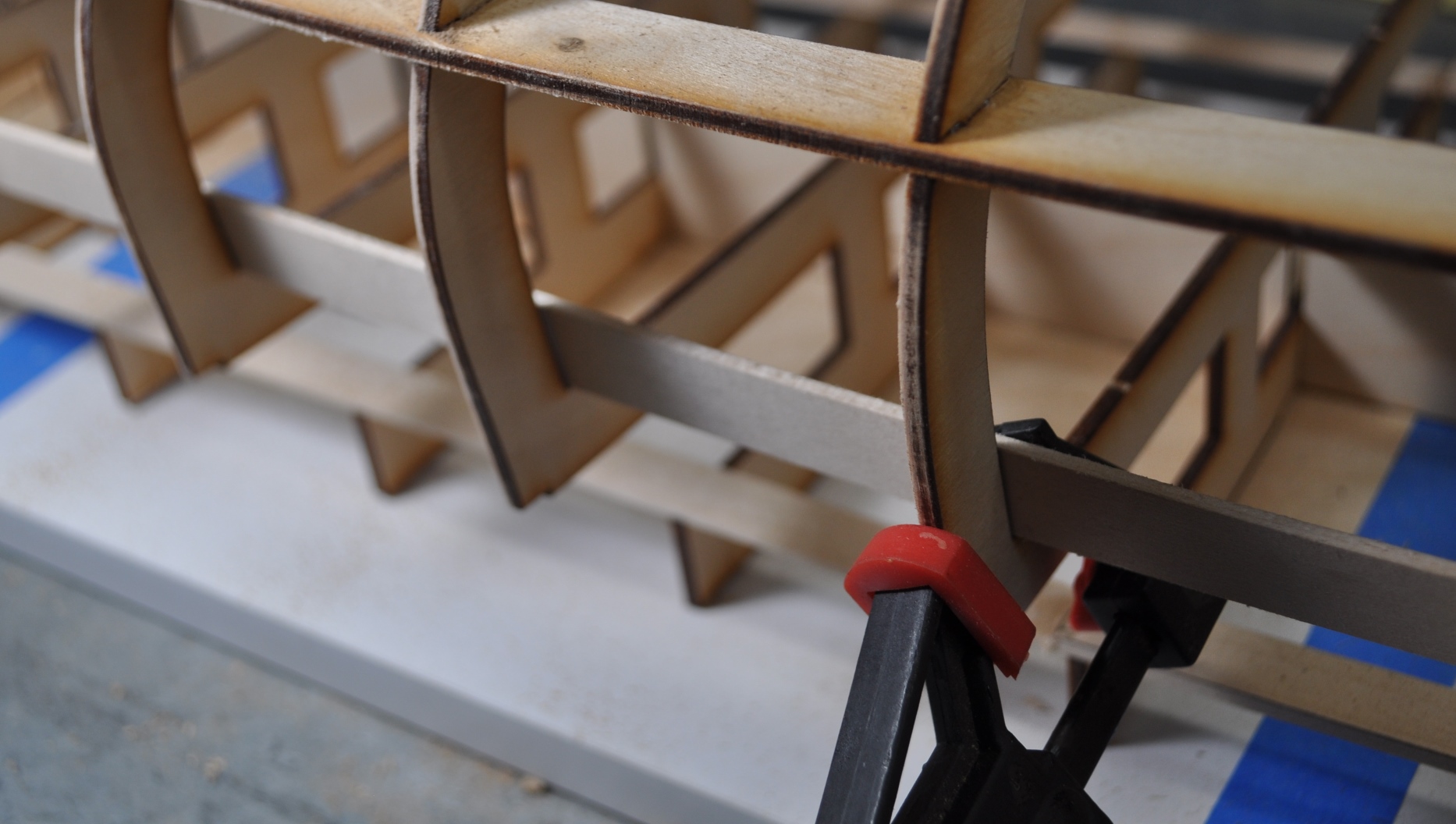 Note that, in this particular construction, planking starts at the sheer line, where the modeller has pinned a thin plank in the deck notch in order to establish the sheer. Note, also, that in this first construction, the builder has added some thin stock to the inside of the frames to add a little stiffness. After seeing this, we have added a horizontal stiffener to the frame set itself.