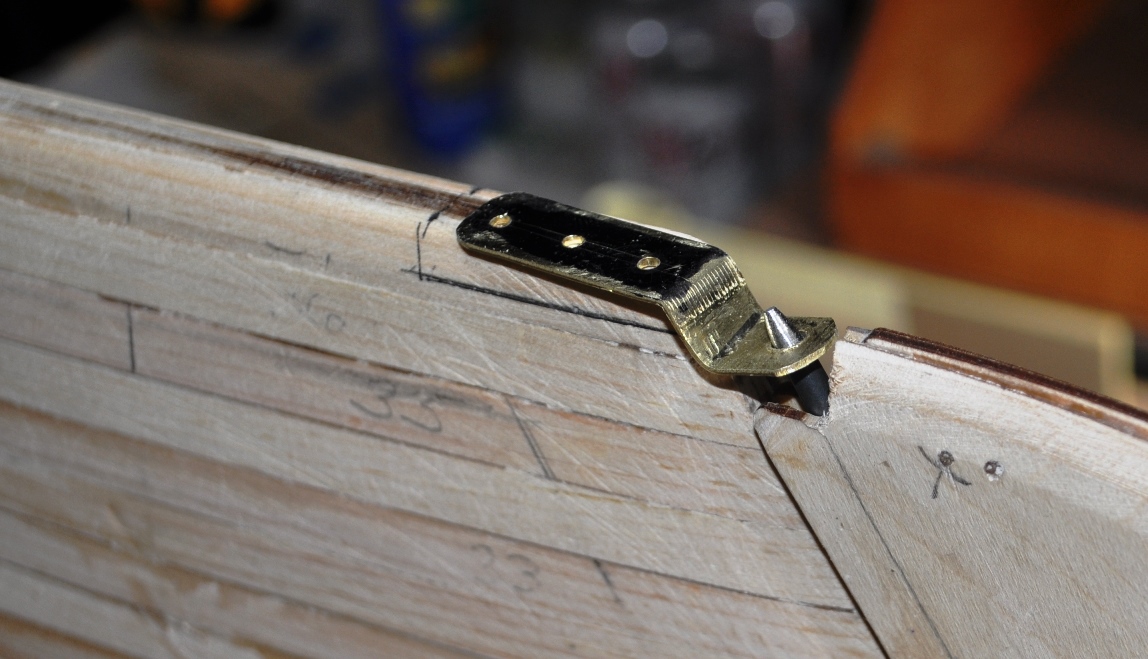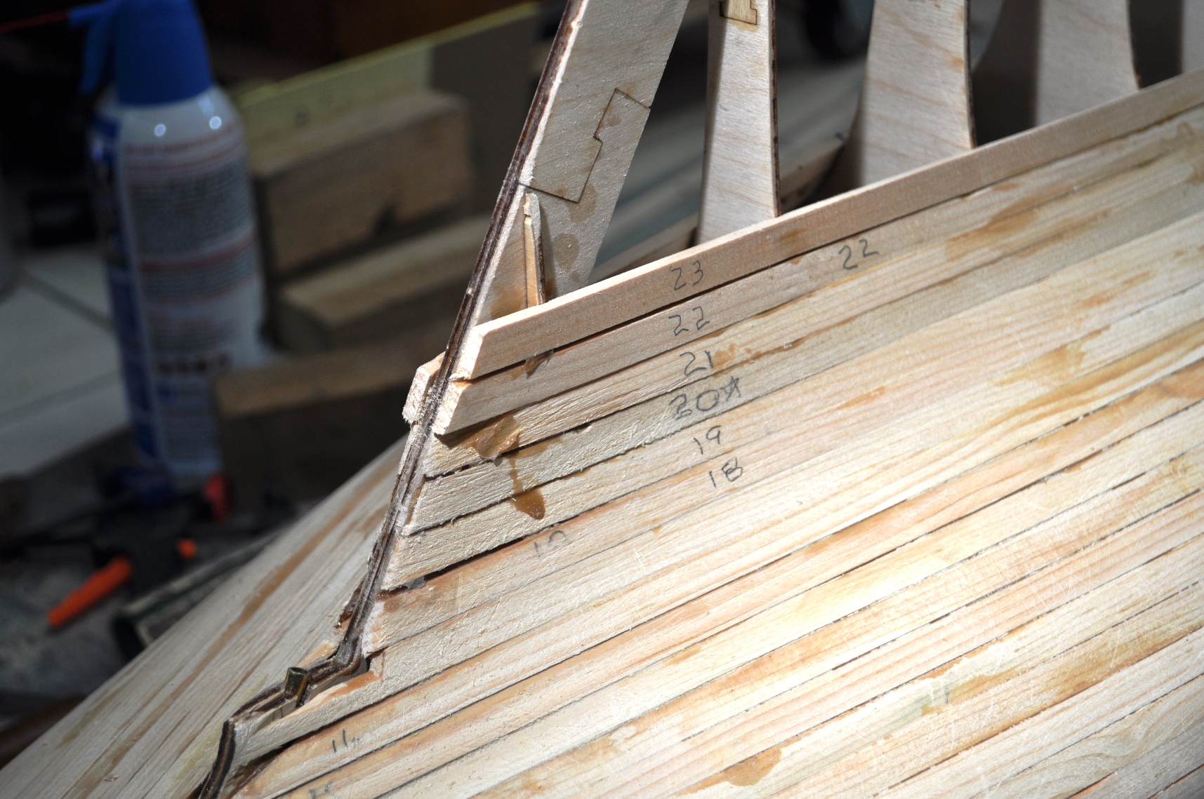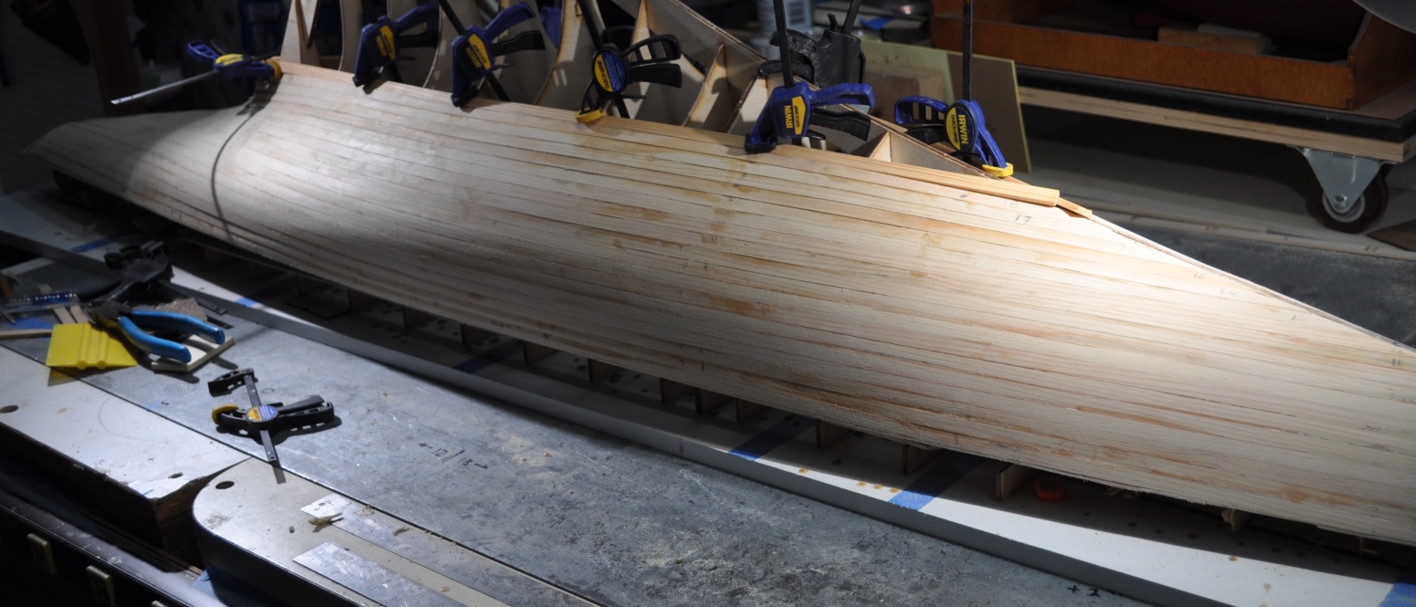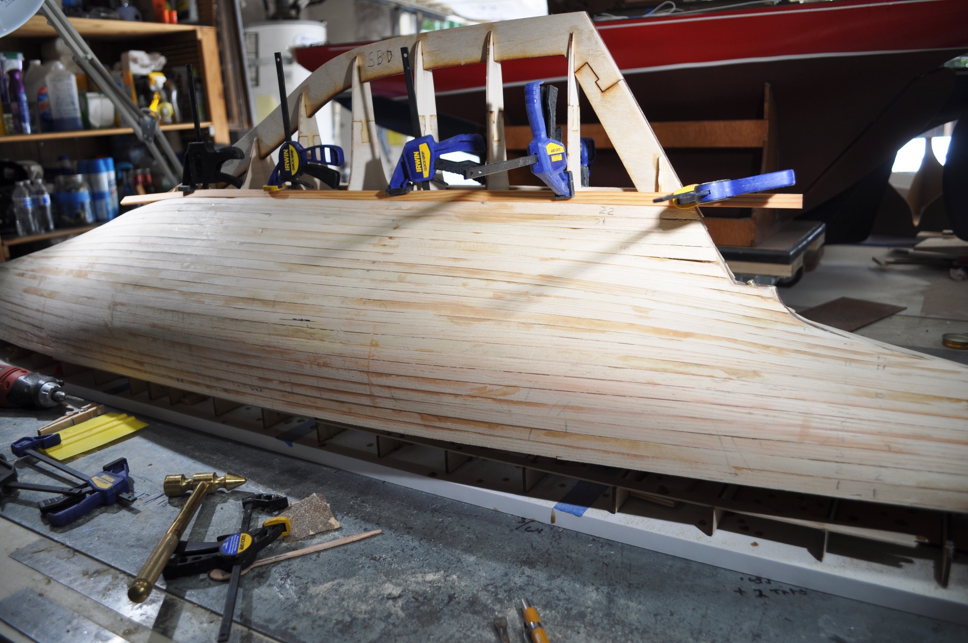 Planking should be quite straightforward. I would plank one plank on each side at a time, and make sure they are carefully aligned. At the sheer, one can plank right up to the edge, or a modeller could leave a small space for a plank that would create a toe-rail around the boat.