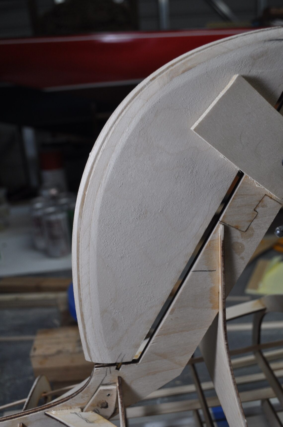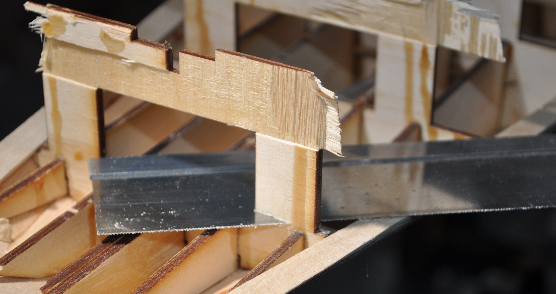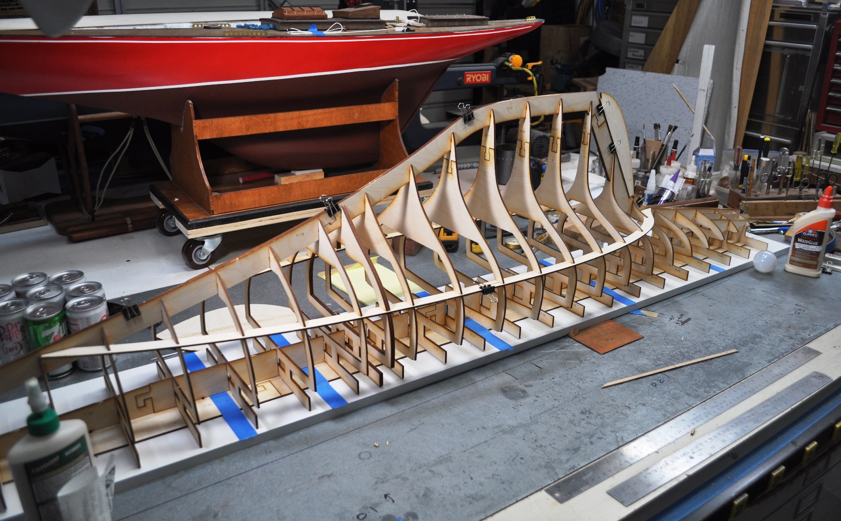 Once you have an idea of how things will work, you can install the T-rail carefully on your building surface. Having installed everything loosely once, you will be more confident that everything should fit together nicely. Note that there are a couple of frames at the mast that fit in a single notch. If one starts from the bow with a few frames, and then from the stern with a few frames, it becomes evident that two frames must fit close together.