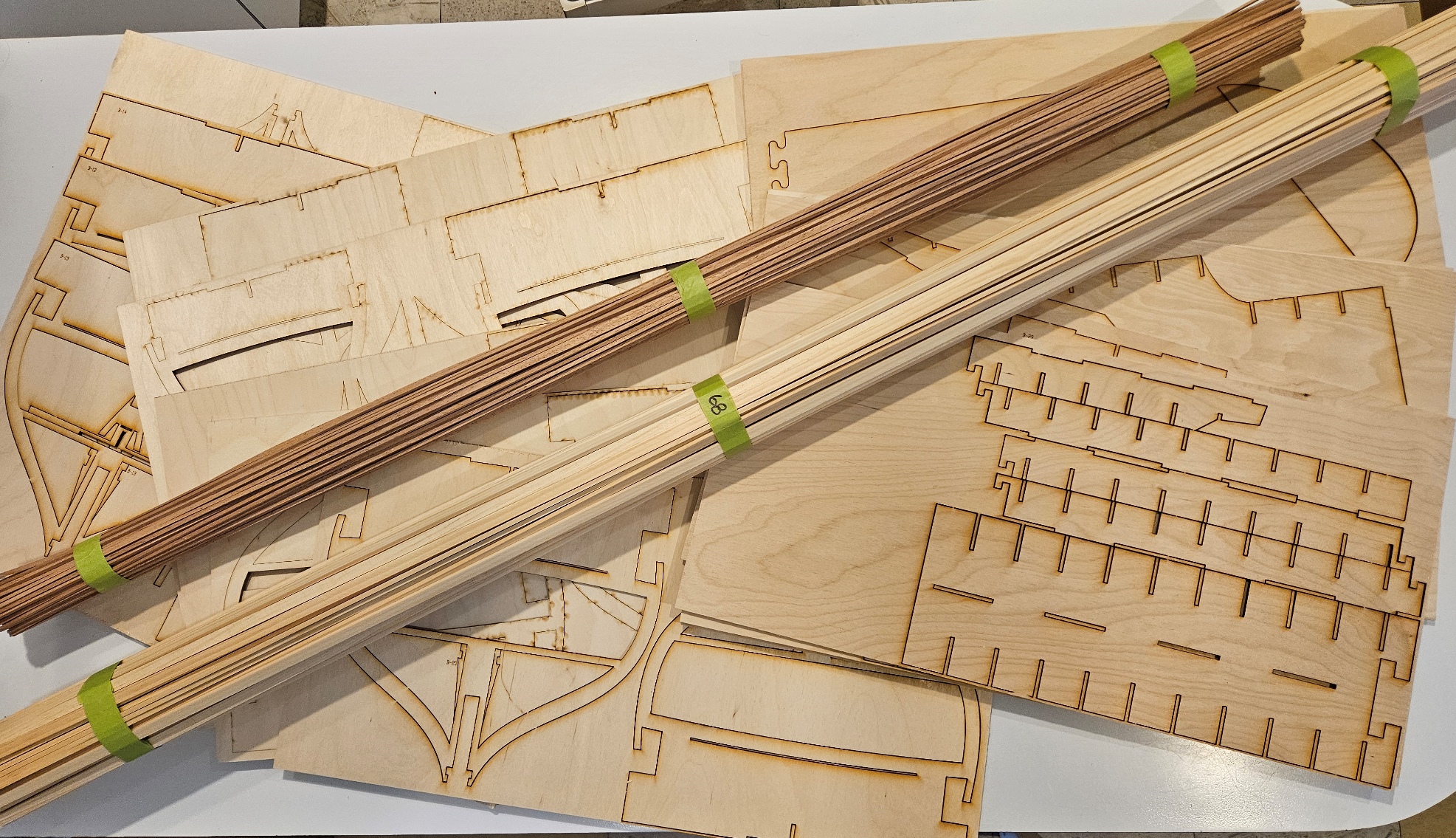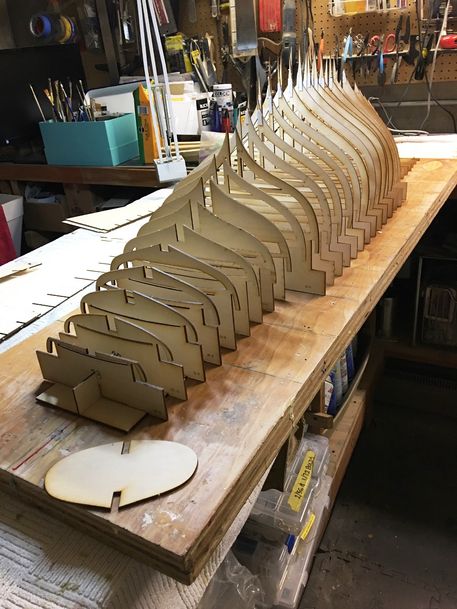 - Remove all the pieces and verify that there are identifying numbers visible on each one. Lay out all of the keel pieces, verify fit and orientation. Carefully verify that all frames and other basic parts are inventoried and available.