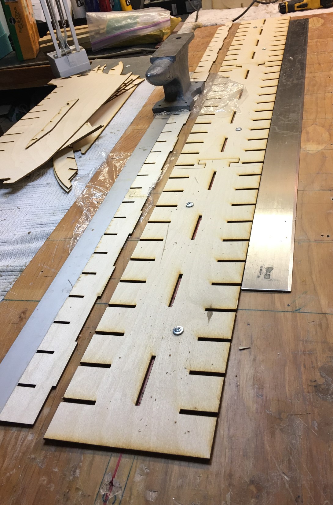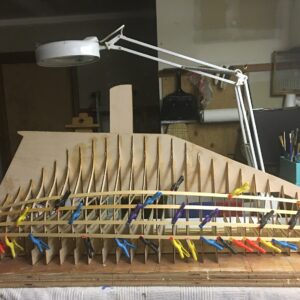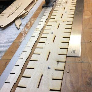 - Assemble “T” rail and screw to building board. I use ½” self tapping screws and a straight edge to verify accuracy and structure. Lay keel pieces out in proper order and glue together, this may take several steps. Use straight edge to verify. It is very important to make sure the structure is perfectly straight. Measure twice, three times, four times, before installing the T-rail. Weigh down on flat surface with clear plastic protection. Sand after assembly.