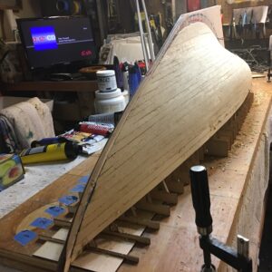 Following completion of this step, which, on the Mower, went remarkably quickly, with virtually no “spiling” of most of the planks, I fair the first layer, using easily sanded wood filler. This insures that the final layer of the hull is very fair with no bumps or depressions. I then add the second layer, planking from the sheer down. I have found that using this sequence removes any chance that seams are aligned.