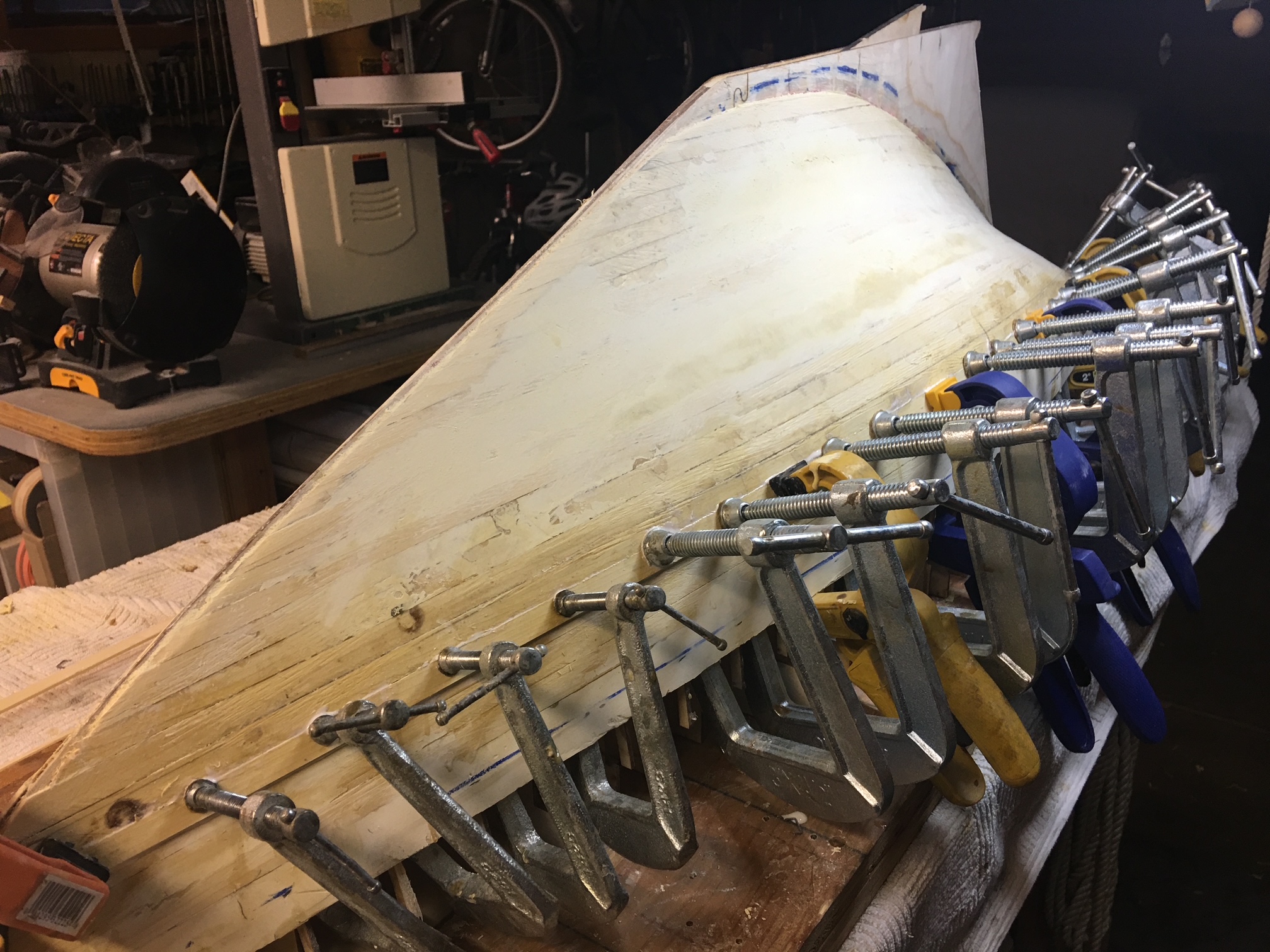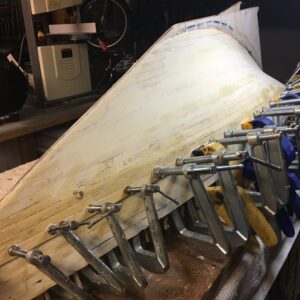 Amazon). I go through 50 sanding down a hull. - I chose not to fiberglass the hull exterior, but used several layers of epoxy as the preliminary finish. This step creates a durable hull that avoids creating more dents and bruises while working on the hull. Seeing the final shape of the hull is very satisfying.